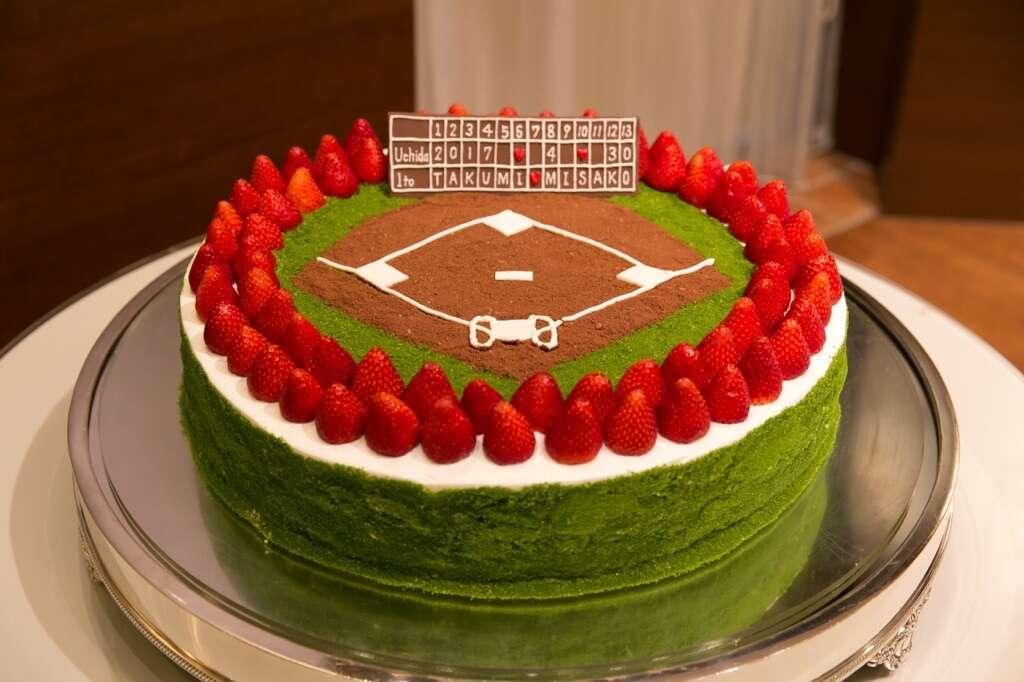 また、ウエディングケーキはふつうのデコレーションではなく、同じく野球をイメージしたデザインに変更を提案。ほかにはない、唯一無二のオリジナルケーキにふたりも感動でいっぱいに。