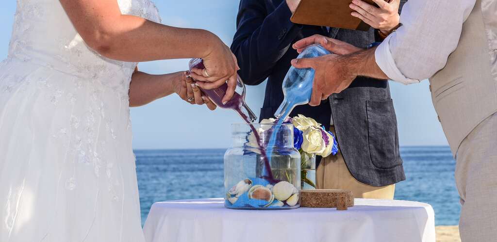 コンセプトカラーは海らしさを意識してブルーに、演出では”サンドセレモニー”を採用。ブルーと新婦様がお好きなパープルの砂をひとつの入れ物に注ぎ込み、砂の色が作り出す模様によって、世界にひとつしかないオリジナルアートを完成させました。当日は、現地のプロにお任せし、私もゲストとして参加させていただきましたが、みんなでSNSに写真をアップしたりと、終始笑顔あふれるハッピーな結婚式となりました。