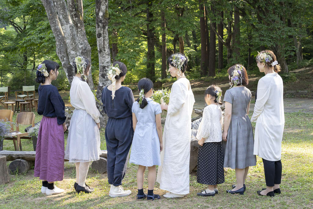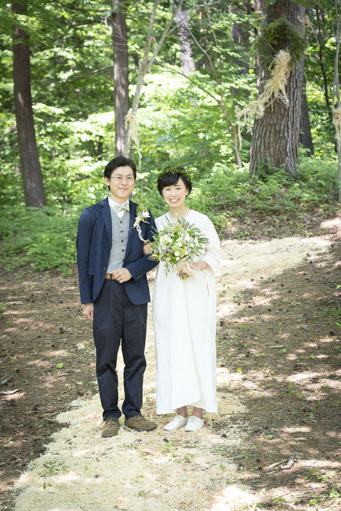 「お食事や肌に触れるものは大切」というお考えをお持ちのおふたりで、自然を生かしたウエディングがご希望でした。会場となったのは山の中にある古民家カフェ。お料理は有機栽培で作られたこだわりのお野菜が中心。ウエディングケーキはグルテンフリーのものをご用意させていただきました。自然の中で挙げる自分達らしいウエディングを望んでいらっしゃったので、新婦様は、自然の花に馴染むようにリネンのワンピース丈を長くし、ドレスに見立てることに…。そして建築関係のお仕事をしている新郎様から「木を使って何かをしたい」というご要望がありましたので、新郎様が作った木のフォークとスプーンをご用意。当日ゲストの皆様にヤスリをかけていただき、“オリジナルのフォークとスプーン”を完成させるというワークショップを開催。おふたりのご希望で、パーティーの演出は入れず、司会も立てませんでした。