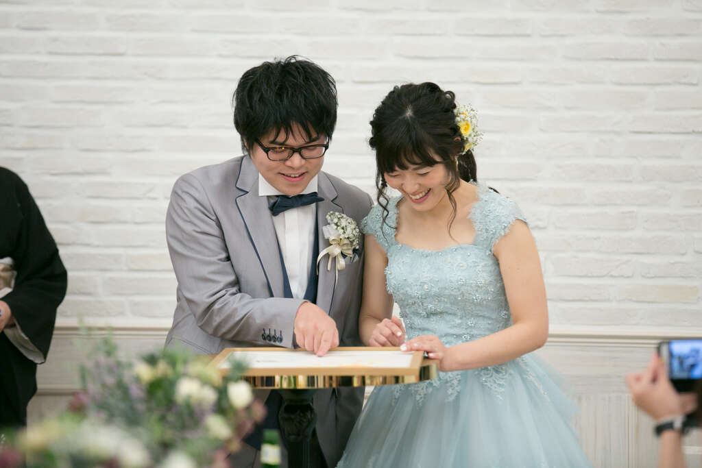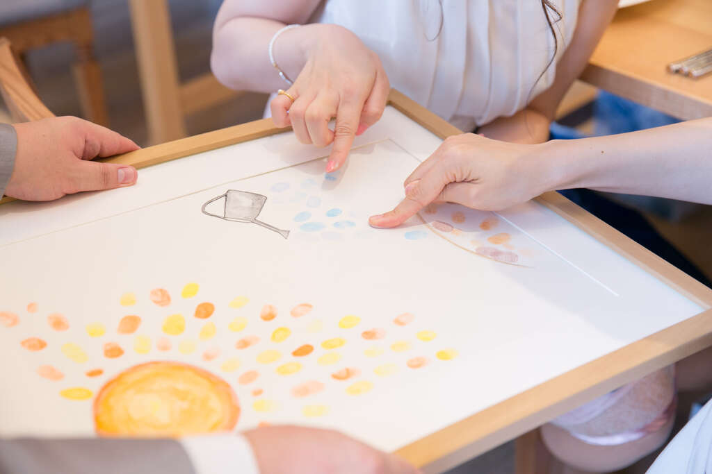 ゲストの方々には“水”の青、“太陽”の黄やオレンジ、ご親族様には“大地”の茶色など、土台となる絵に皆様からフィンガースタンプを押していただき、披露宴の後半で新郎新婦様が“芽”の部分をスタンプすることで「太陽から日差しが降り注ぎ、水を与え、大地に新芽が芽吹く」というストーリーの絵が完成するという演出。ちなみに、司会者とウエディングプランナーの私も“おふたりの周りを飛び回る蝶々”のパーツのフィンガースタンプに参加させていただきました。世界にたった一つの絵が出来上がり、笑顔が絶えない温かい時間となりました。